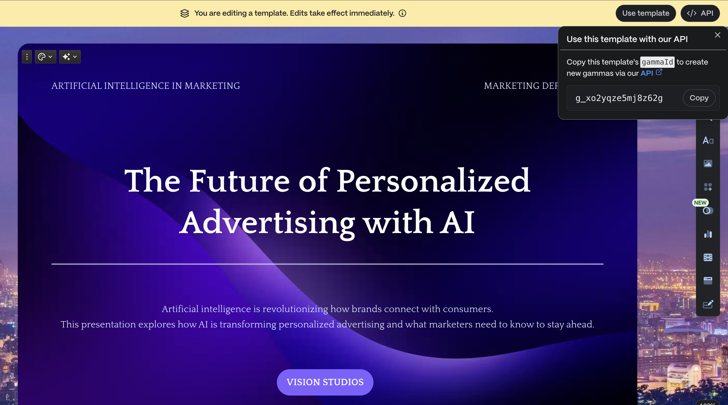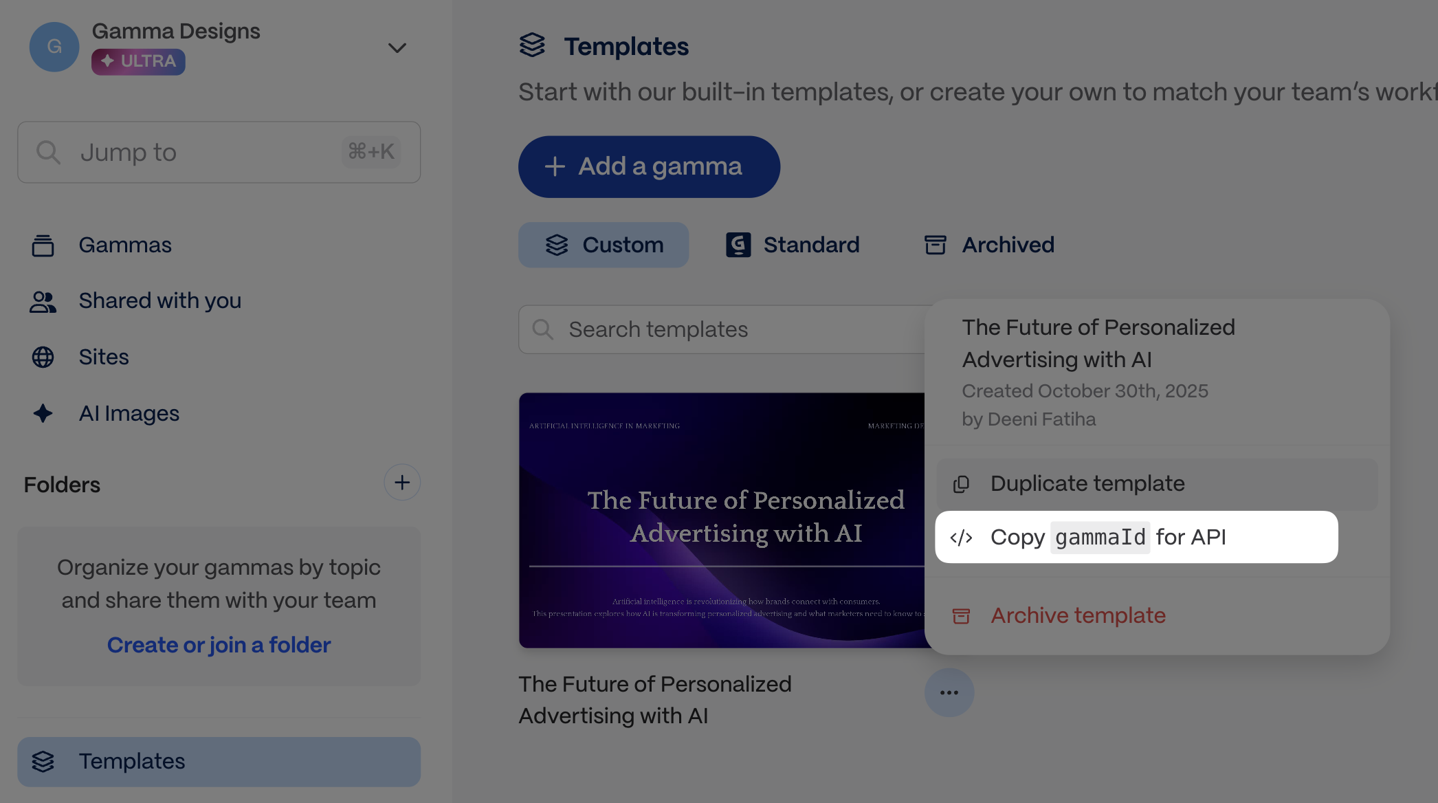 gammaId (required)Identifies the template you want to modify. You can find and copy the gammaId for a template as shown in the screenshots below.